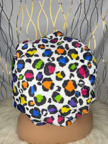 White rainbow leopard print Plush Bonnet/ royal blue satin adjustable