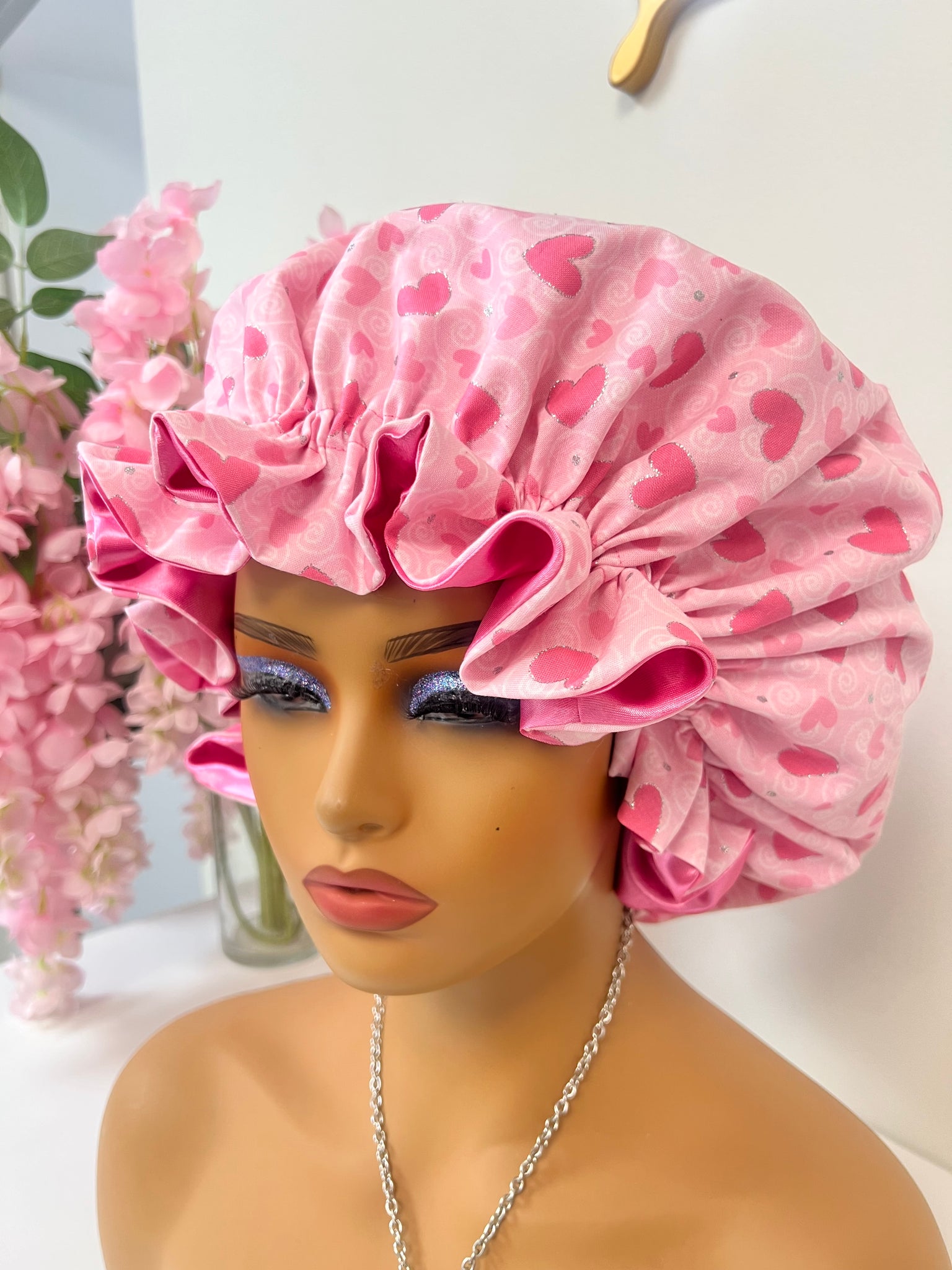 Bubblegum Pink & Silver Hearts Adjustable Ruffles Cotton Bonnet