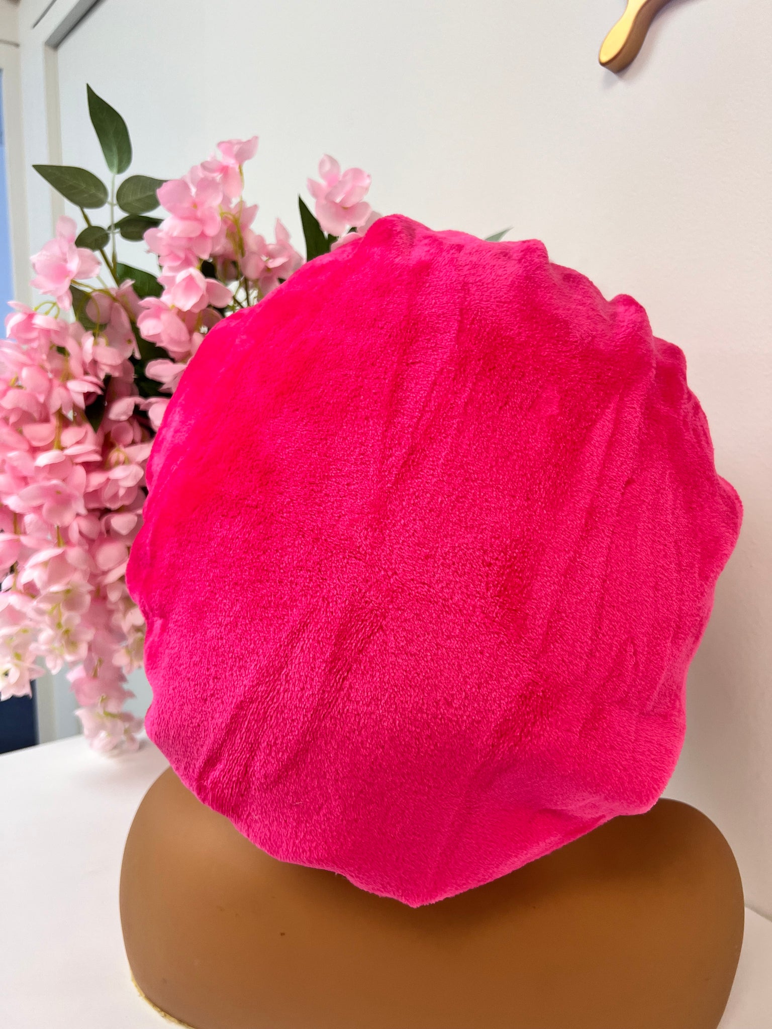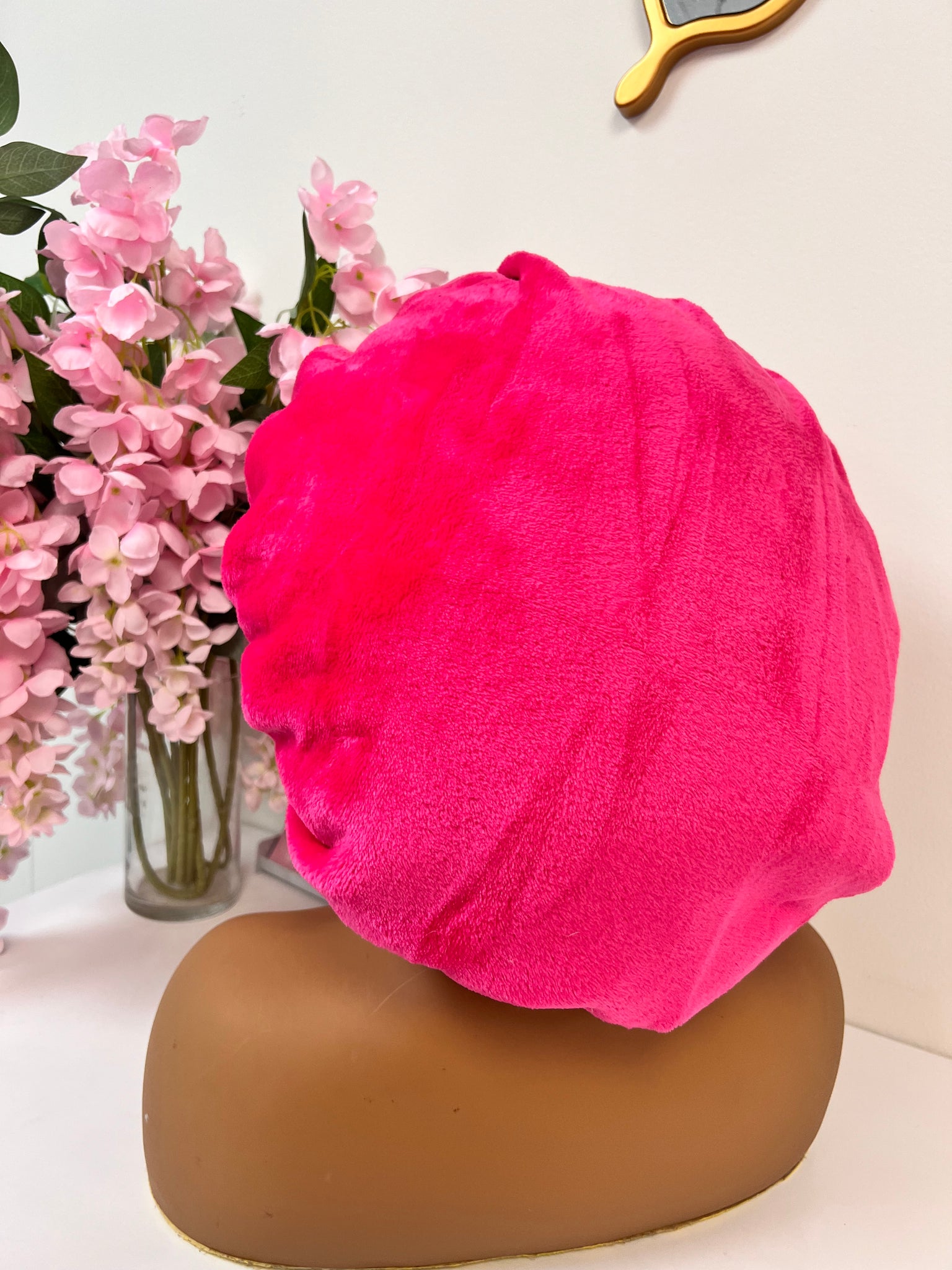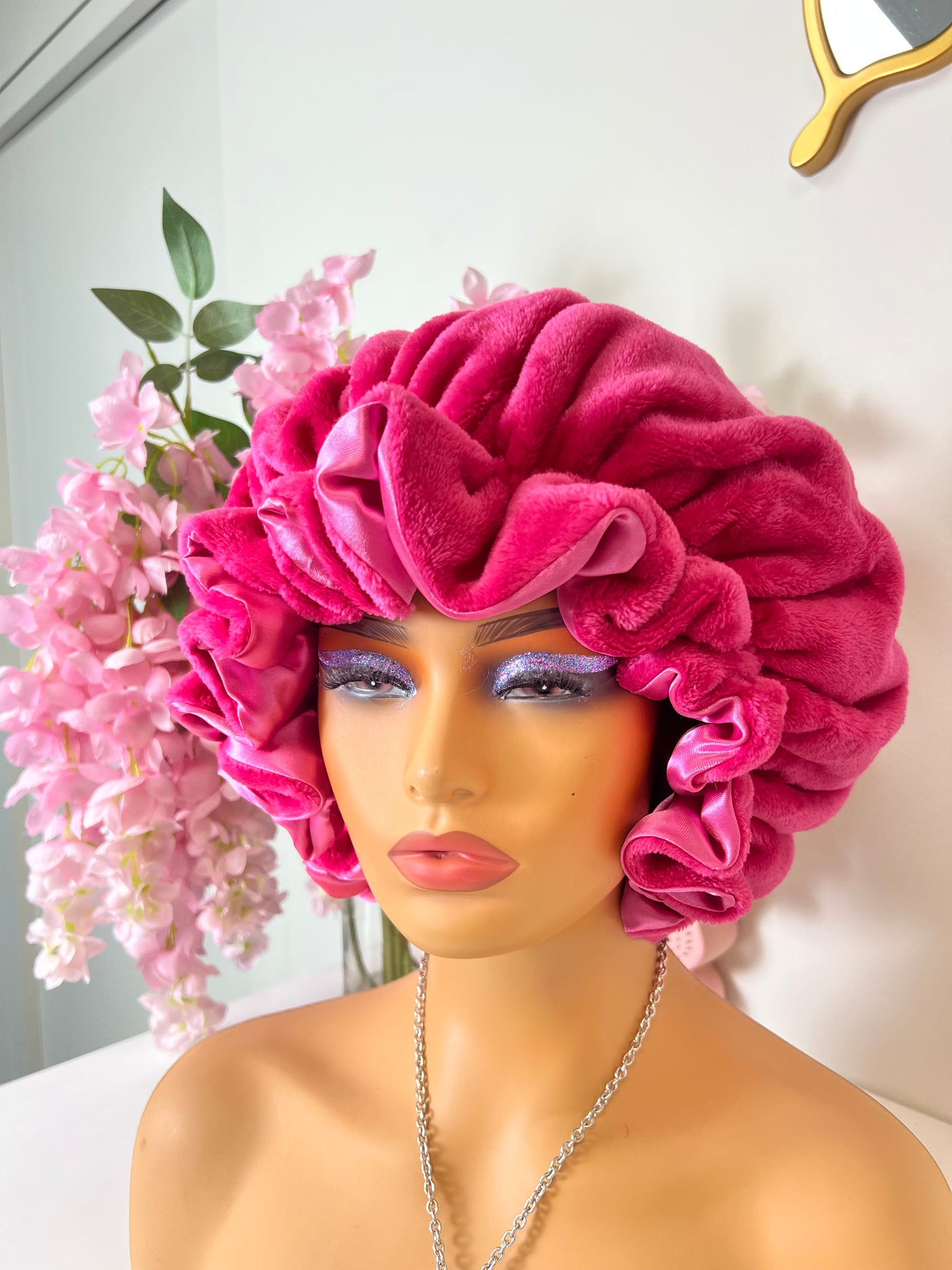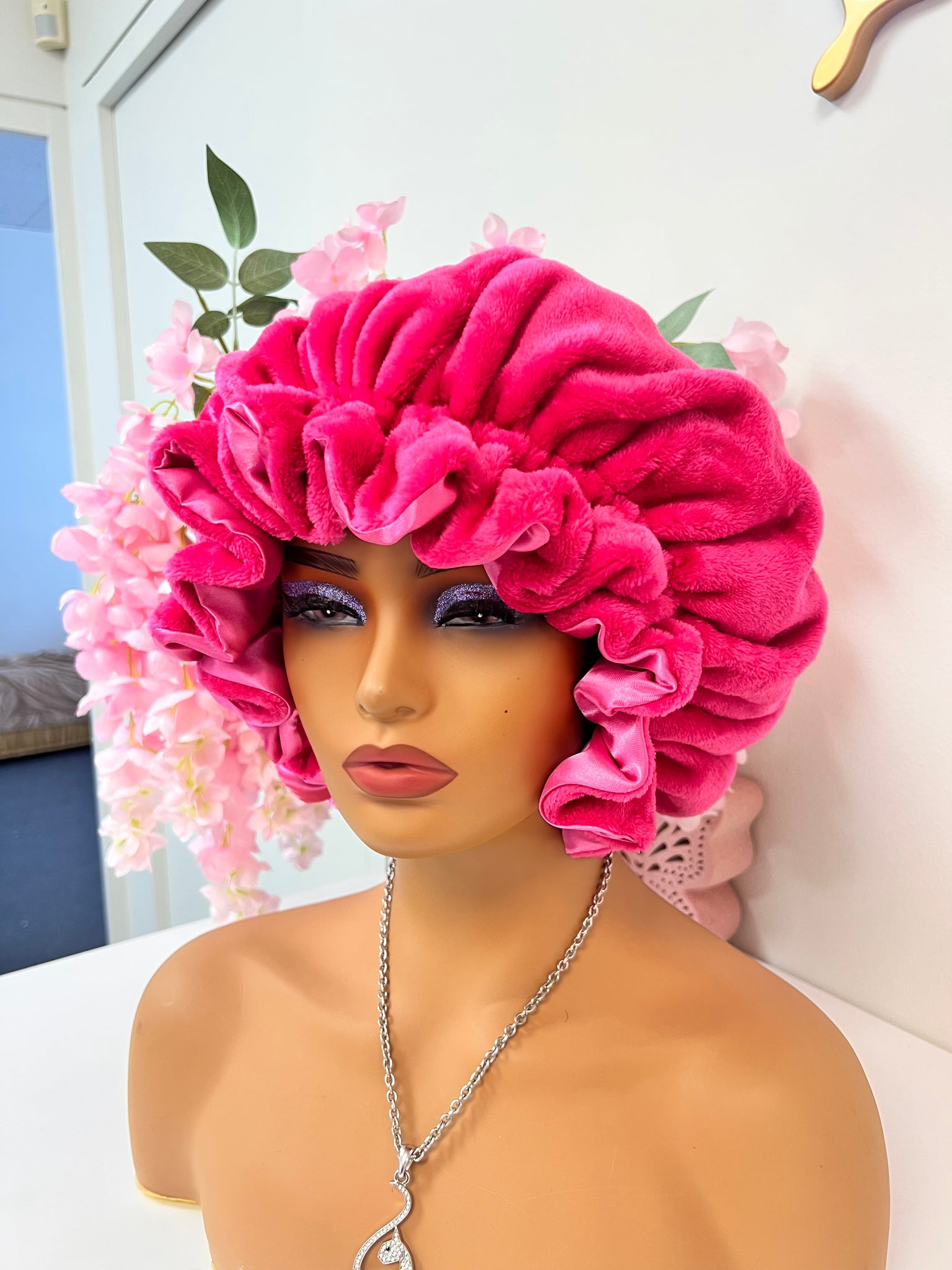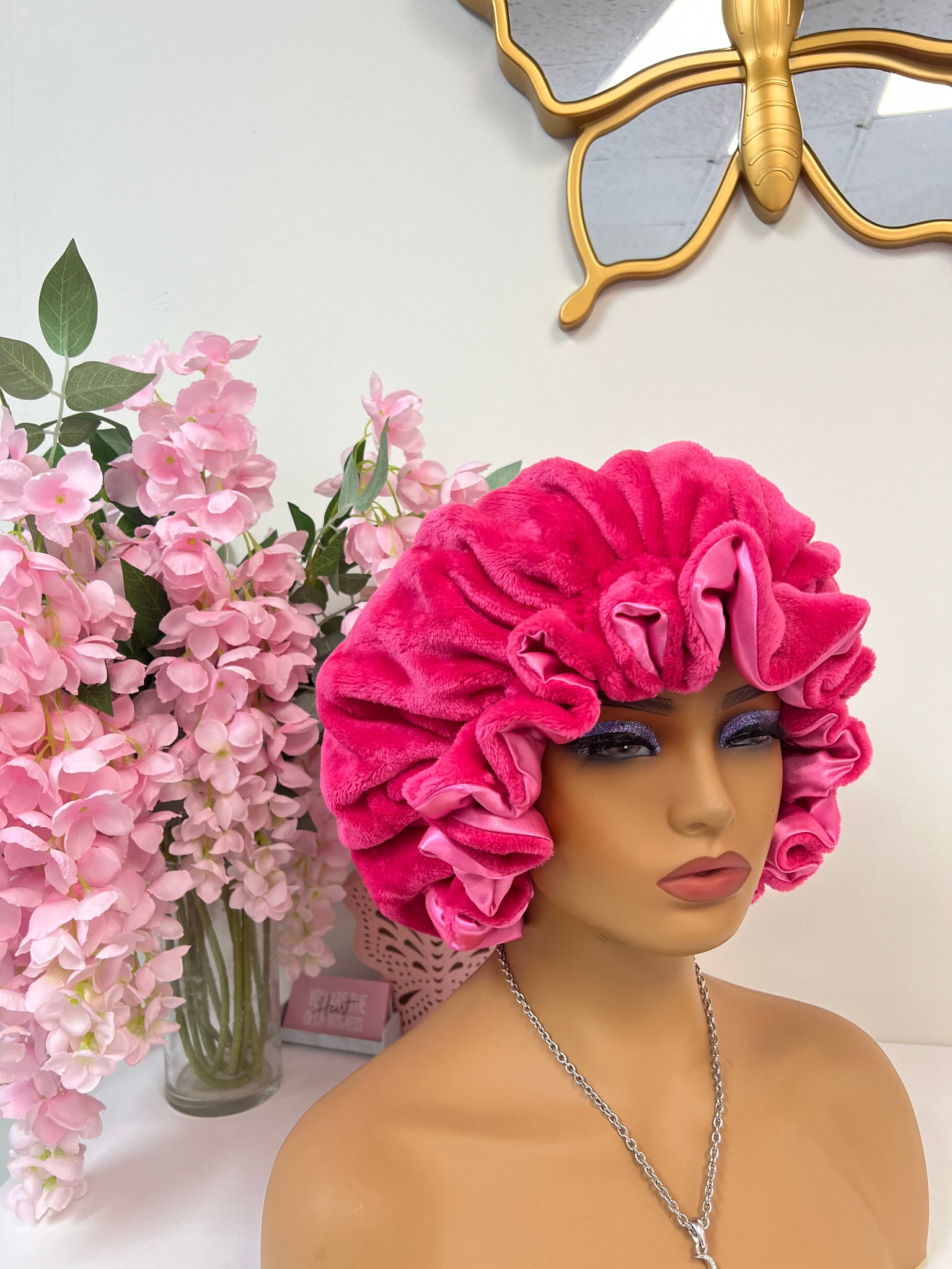 • Load image into Gallery viewer, Hot Pink Ruffles plush bonnet adjustable