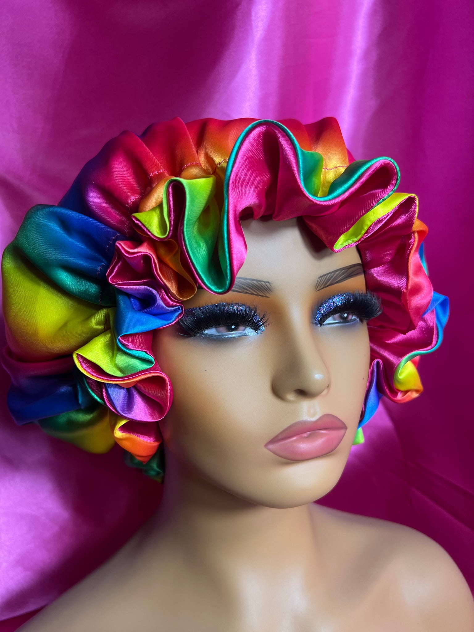 Introducing our new Satin Scrunchie Adjustable Bonnet - the perfect hair accessory! Made with soft satin material, this bonnet is not only stylish with its rainbow design but also gentle on your hair. Say goodbye to frizz and hello to a good hair day every day.